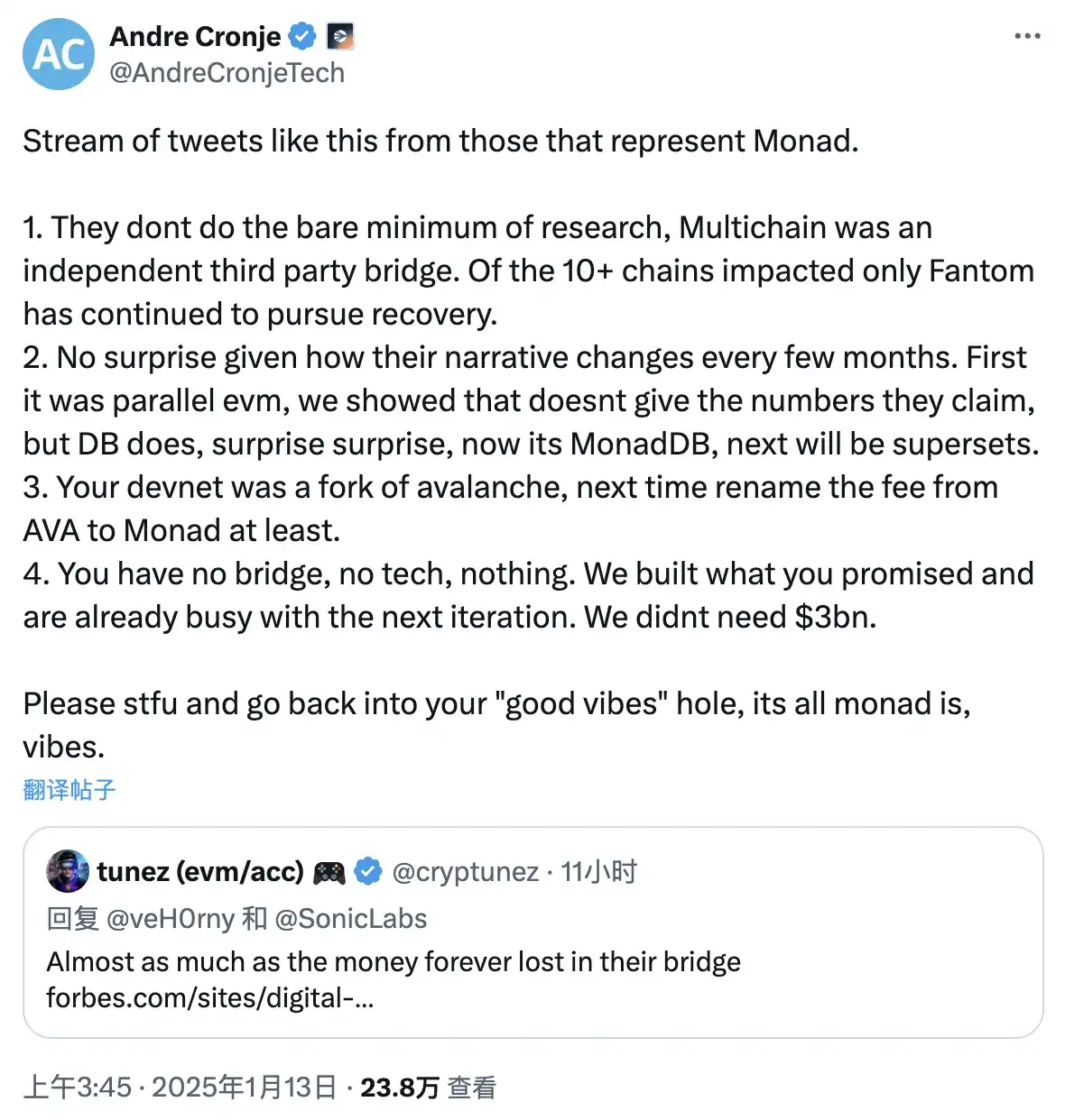 作为后市社区期待度最高的两大 Layer 1 赛道代表,Sonic 脱胎于曾经的热门 Layer 1 网络 Fantom,现由知名 DeFi 大神 Andre Cronje 操刀重设,Monad 则生于做市巨头 Jump Trading,去年 4 月曾以 30 亿美元估值完成由 Paradigm 领投的 2.25 亿美元融资。从赛道竞争角度来看,两大 Layer 1 确实存在着天然的竞争关系,但似乎也不必如此直接言语相向,所以昨夜到底发生了什么事呢?