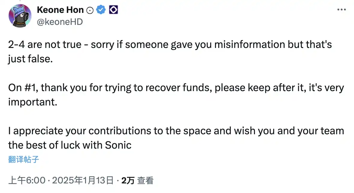 Keone Hon 先是否认了 AC 第 2-4 点关于 Monad 的批评,并强调此类传言均不正确。同时,Keone Hon 还赞扬了 Sonic 继续尝试追赃的行为以及 AC 对行业的贡献,最后还祝福了 AC 及 Sonic 的未来发展。
