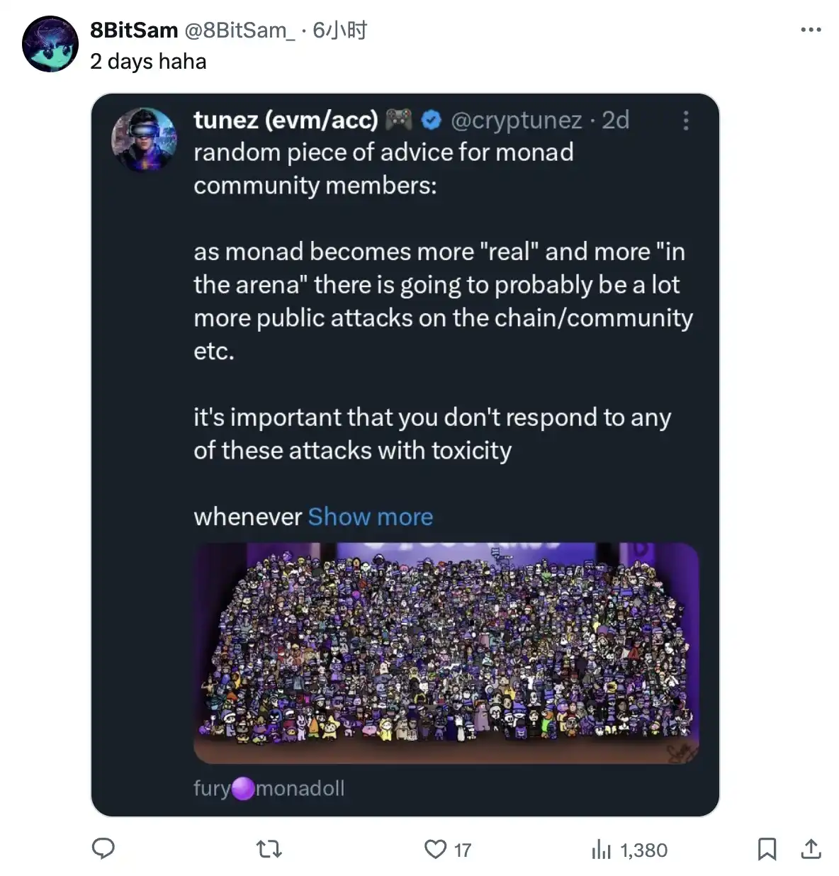 多位 Sonic 社区成员纷纷开始了对 tunez 的回击,有人还翻出了 tunez 两天前说过的话「随着 Monad 越来越受欢迎,也将会遭受越来越多的攻击」,言辞直指 tunez 此举是受到了 Sonic 热度的刺激。