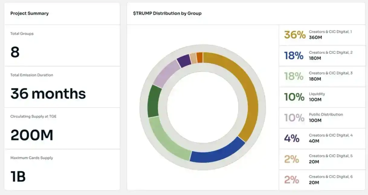 据「特朗普正牌 Meme 币」TRUMP 的官网内容显示,Trump Meme 不涉及政治,与任何政治竞选活动或任何政治办公室或政府机构无关。值得注意的是,特朗普集团的附属公司 CIC Digital LLC 和 Fight Fight Fight LLC 共同拥有 80% 的 TRUMP,但需遵守 3 年解锁计划。Fight Fight Fight LLC 的所有者 CIC Digital LLC 和 Celebration Cards LLC 将获得 TRUMP 交易活动产生的交易收入。