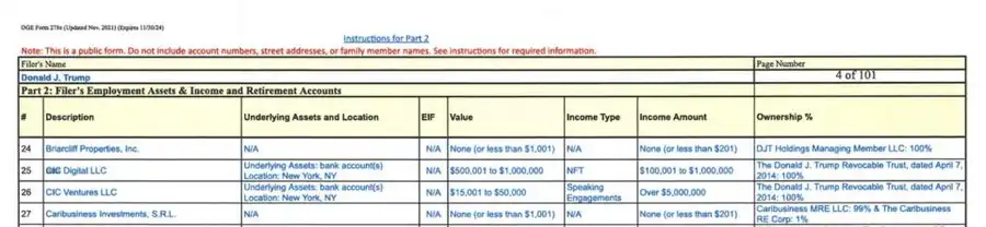 根据特朗普公开的税务申报,他通过参与与 NFT 相关的交易赚取了大约 720 万美元。这笔收入与他在 $TRUMP 项目中的合作伙伴 CIC Digital 有关。梅拉尼娅则通过一项与 NFT 销售相关的协议,单独赚取了超过 33 万美元。