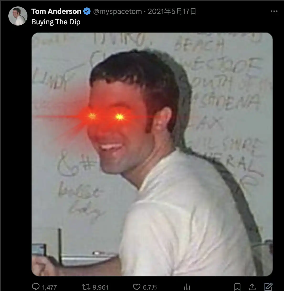 而该项目当前与 Crypto 基本没有关系,但笔者认为创始人 Tom Anderson 这条 3 年前的推文 Buying The Dip 加上激光眼的 Tom 显得十分 Meme。