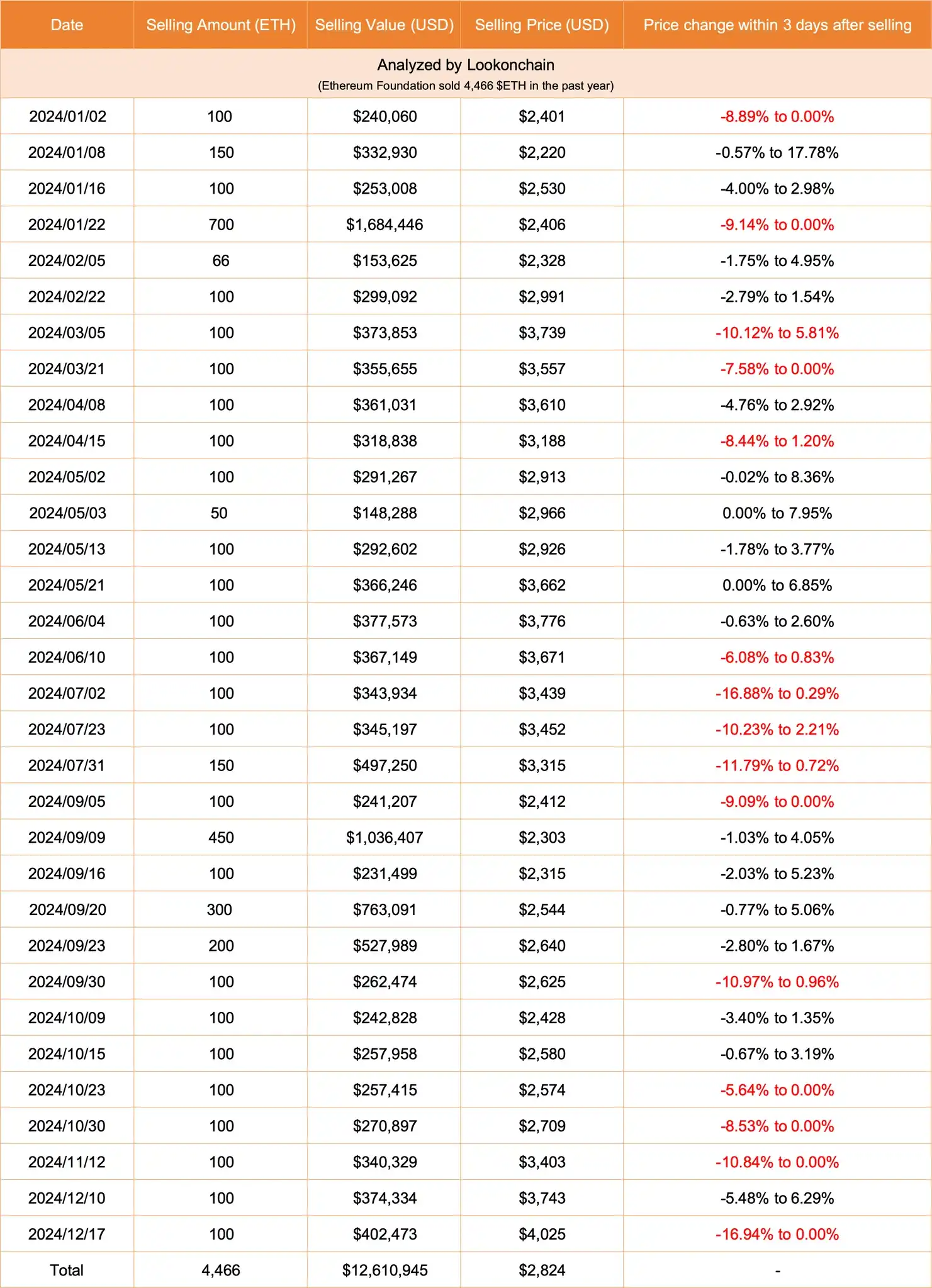 最后,砸盘速度极快。这是无数人对 EF 诟病最多的一点,并非其他生态不存在类似卖出生态代币的现象,而是 EF 的砸盘总是像是阶段性见顶信号一般,而且,往往这个时候就没人提「以太坊信仰、坚定 HODL ETH」了。此前,据 Lookonchain 监测,自从 EF 于 12 月 17 日售出 100 枚 ETH 以来,ETH 的价格已下跌约 17% 。EF 2024 年在 32 笔交易中售出了 4, 466 枚 ETH(约合 1260 万美元),其中 15 笔交易是在短期内最高点卖出的。