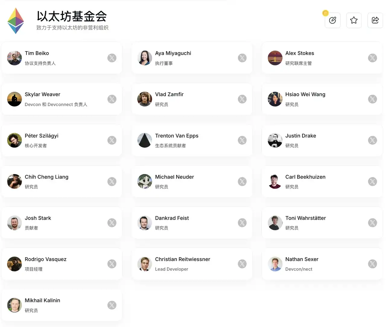 与此同时,EF 在职人员包括执行董事 Aya、Tim Beiko 在内的协议支持负责人以及 Justin Drake 在内的诸多研究员。但组织管理的混乱,也由此显露端倪:前不久,以太坊基金会研究员 Alex Stokes 宣布与 barnabe.eth 共同担任 EF 研究部门联合负责人,直到这时,很多人才第一次知道,原来 EF 旗下研究部门包括应用研究小组、共识研发、密码学、协议安全以及 RIG 五个团队。这就和此前 Tim Beiko 在自己的 X 平台账号发布部门新进人选信息的时候,人们才知道 EF 人员流动如此僵化一样。