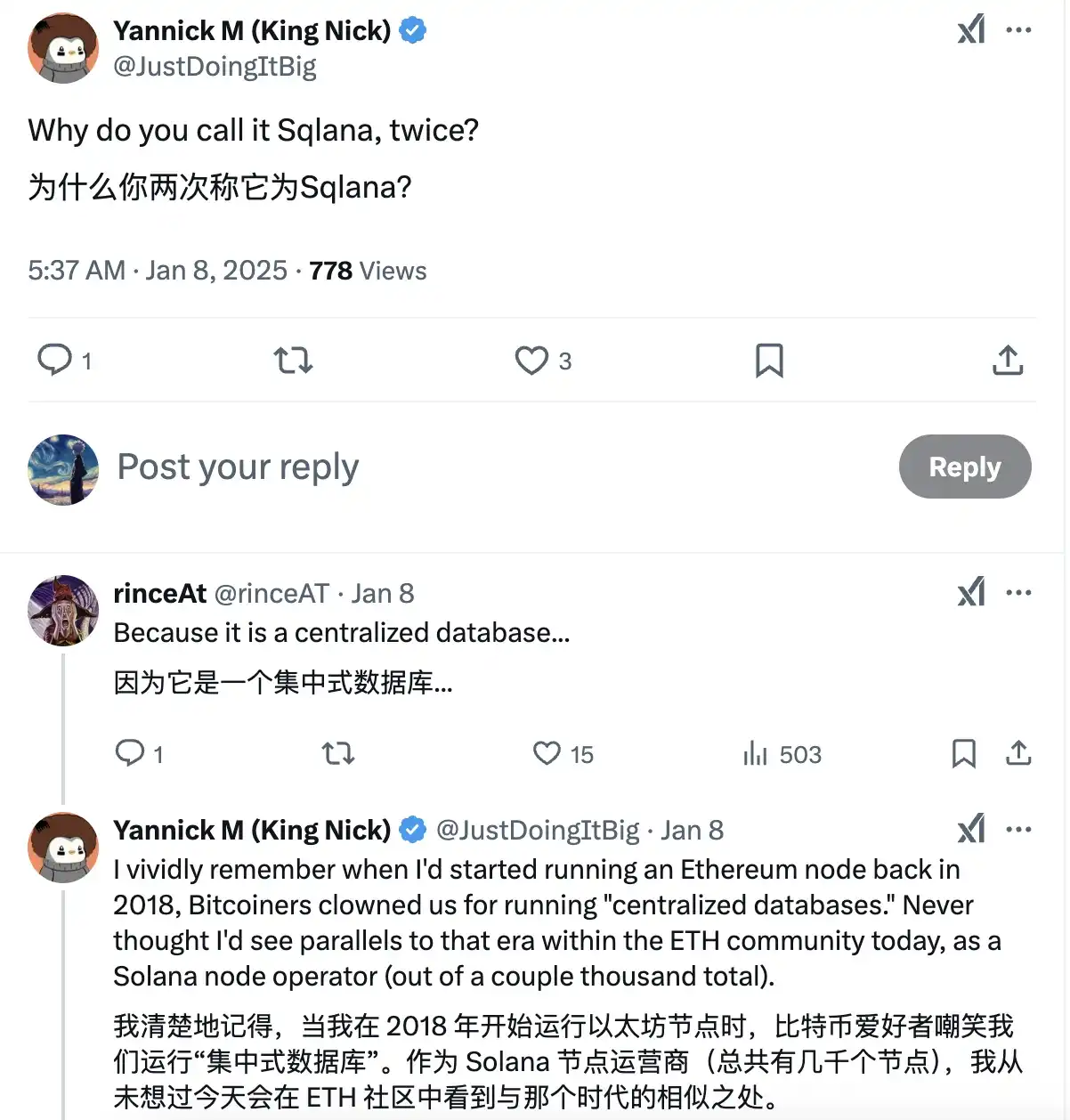 无独有偶,在以太坊新闻周刊创始人 Evan Van Ness 回应该新闻通讯即将关闭的推文中,他将「Solana」称呼为「Sqlana」,疑似暗指 Solana 是一个中心化数据库,评论区也有人提到了这一点。资深节点运营商 @JustDoingItBig 对此表示费解: 2018 年时,比特币信仰者嘲笑以太坊节点运行「集中式数据库」;而现在,以太坊拥趸们的表现同样如此。