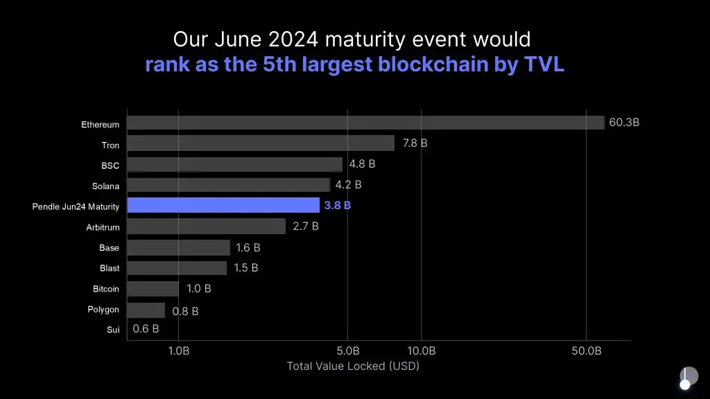 若以 TVL 衡量,Pendle 的规模足以成为第五大区块链,仅次于以太坊、Solana、Tron 和 BNB Chain。