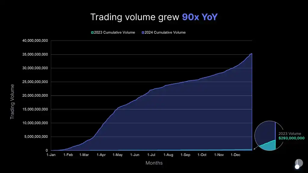 2023 年初,我们的总锁定价值(TVL)为 2.3 亿美元,到 2024 年底已飙升至 44 亿美元,增长 20 倍。交易量增长更为惊人——日均交易额从 2023 年的 110 万美元跃升至 2024 年的 9640 万美元,涨幅近 100 倍。随着用户对协议的信任增强,持有超 1 亿美元 PT 头寸的用户已屡见不鲜。