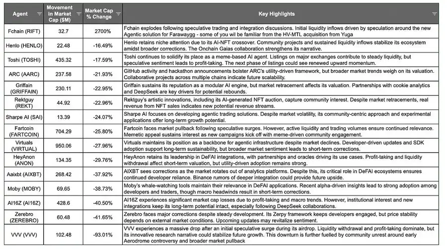 这一周对整个加密市场来说可谓是一次重创,AI agent 也未能幸免,上周的 agent 市场市值蒸发了 42%。不过,我认为这只是短期的波动,因为资本暂时与基本面脱节——与这个领域的建设者们交流后,可以感受到未来还有更多的突破,尤其是在 DeFAI 领域。
