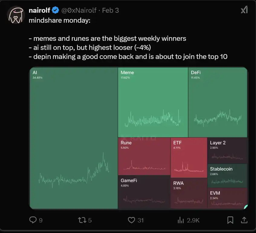 价格走势暂时与基础技术脱节,因为预期与现实之间的波动。我预计今年晚些时候会出现更大的 AI 泡沫,当下一波更强大的 agent 和 DeFAI 解决方案投入生产时。