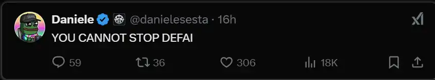 DeFAI 是当前热议的话题,指的是 AI 被集成到 DeFi 技术栈中,推动自主交易;借用 danielesesta 的话——DeFAI 是不可避免的。