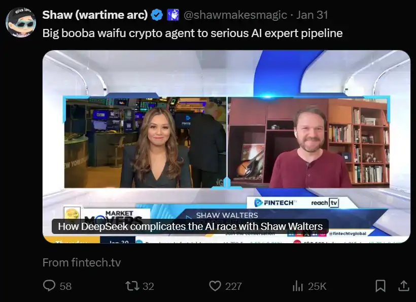 1 月 30 日—shawmakesmagic 在 CNBC 和其他新闻频道讨论了 ElizaOS 和开源 AI 开发。