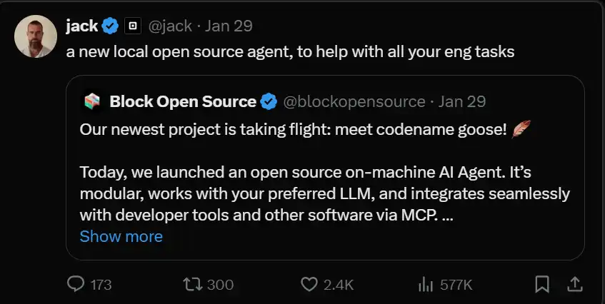 1 月 29 日—Jack Dorsey 推出了 agent「Goose」,进一步推动开源理念,与更加封闭的闭源模型展开竞争。