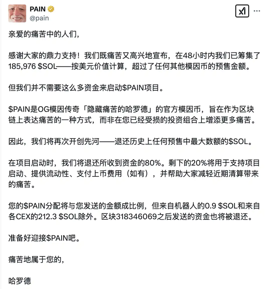 2025 年 2 月 2 日,一场加密社区瞩目的 Meme 币预售拉开序幕。由 Memeland 孵化的 PAIN 项目在 48 小时内狂揽 18.6 万枚 SOL(约 3800 万美元),跻身史上规模最大的 Meme 币预售之列。然而,项目方随后宣布了一项颠覆性决策:退还 80% 募资,仅保留 20% 用于启动与流动性。这一操作既引发了对项目方「诚意」的讨论,也让 PAIN 迅速成为流量焦点。