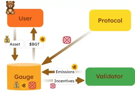 协议有兴趣创建自己的 Gauge(评估指标)并吸引流动性。它们分配给验证者的奖励越多,它们的流动性提供者(LP)就越能在$BGT 中获得回报。结果,更多用户希望成为协议的 LP,购买该项目的原生代币,这也对其价格产生正面影响。这就像一个金字塔,每一层都覆盖着丰厚的甜蜜蜂蜜,确保所有参与者都能在过程中保持活跃。