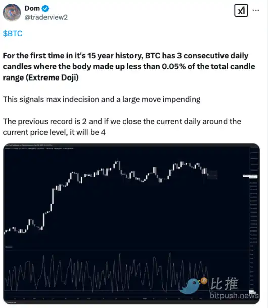 DOM 表示:「在比特币 15 年的历史中,首次出现了连续三根『极端十字星』蜡烛图,每根蜡烛的实体部分仅占整个蜡烛范围的不到 0.05% 。这标志着市场极度犹豫不决,预示着即将出现大幅波动。」