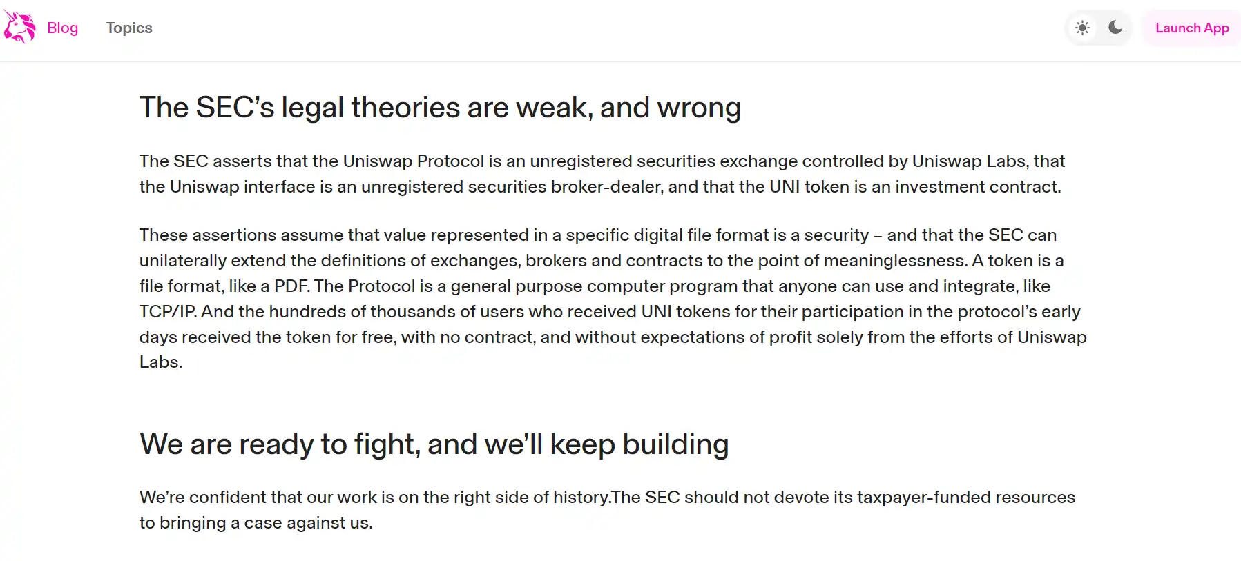 早在 2021 年,SEC 就开始调查 Uniswap Labs,质疑其是否作为未注册的证券交易所运营,以及其 UNI 代币是否构成非法证券发行。2024 年 4 月 11 日,SEC 向 Uniswap Labs 发出过警告,该警告以「威尔斯通知」(Wells Notice)的形式发出,计划对该公司采取执法行动。5 月 22 日,Uniswap Labs 首次发文回应 4 月收到 SEC 向其发出的通知,表示 Uniswap Protocol 是安全、低成本、透明的基础设施,其协议不满足交易所定义,UNI 代币也不符合「投资合同」标准,美 SEC 应该拥抱改进过时商业和金融系统的开源技术,而不是试图通过诉讼将其消灭。7 月 10 日,Uniswap Labs 首席法务官 Katherine Minarik 在社交媒体发文,称(Uniswap Labs 敦促 SEC 不要继续推进其提议的规则制定过程,该提议为了包括 DeFi 及更多内容,不合适地扩展了「交易平台」的定义。