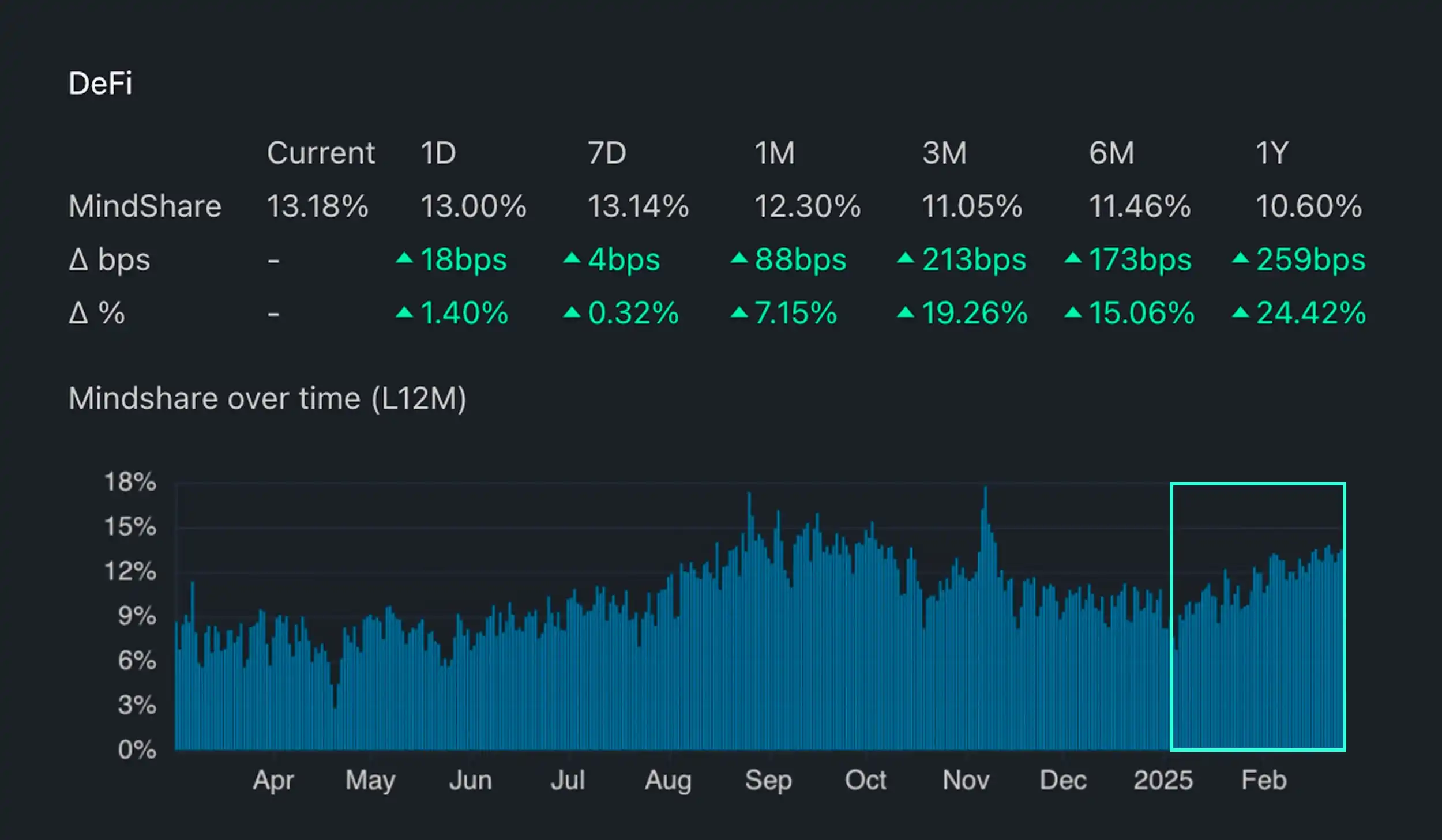 此外,根据 @KaitoAI 的数据,2025 年 DeFi 的心智占有率一直在增长。