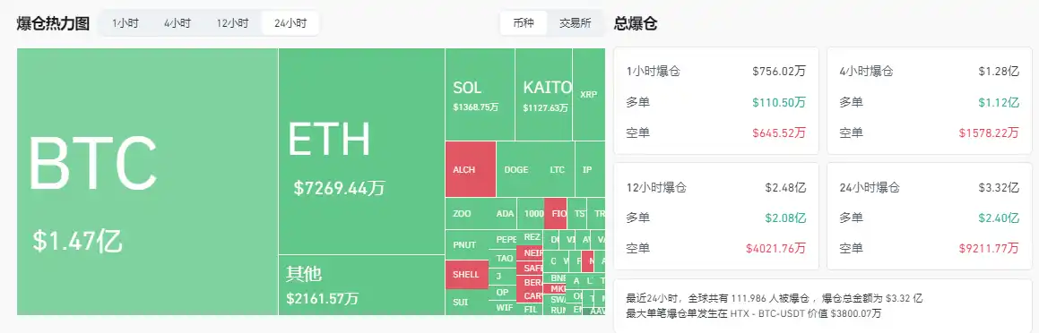 过去 24 小时,全网合约爆仓总金额超过 3.32 亿美元,继续由多头承受。过去 5 天,爆仓资金累计已超过 40 亿美元。