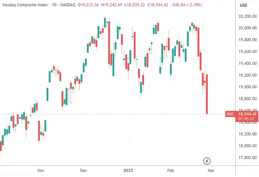 2 月 28 日凌晨,尽管投资者认为自己已经顺利度过了英伟达的财报考验,美国总统特朗普的言论却再次引发了市场剧烈波动。美股遭遇新一轮抛售,标普 500 指数跌幅为 1.59%,收于 5861.57 点;纳斯达克综合指数下挫 2.78%,报 18544.42 点;道琼斯工业平均指数跌幅 0.45%,收于 43239.5 点。