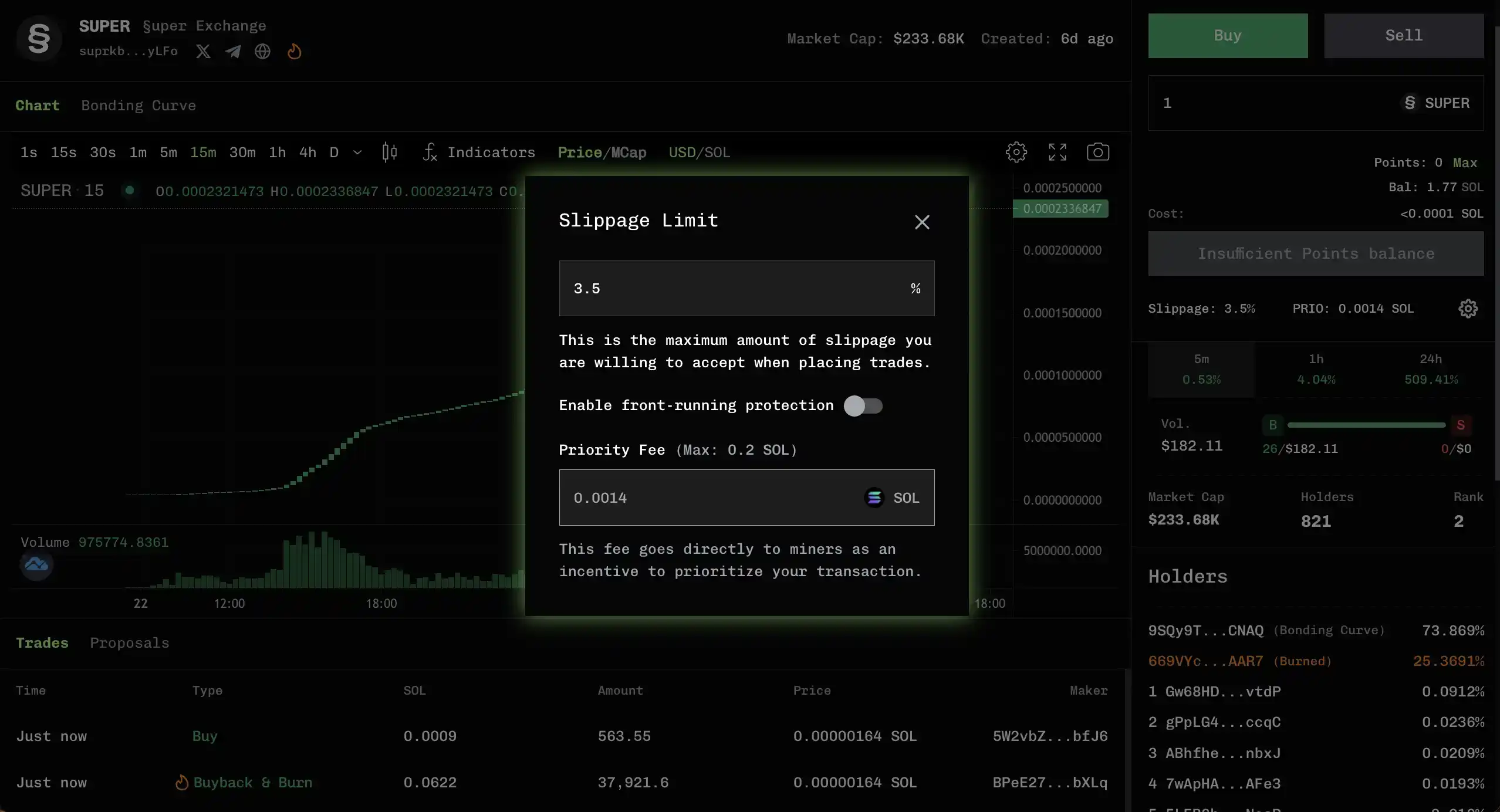 Super.exchange 也有内外盘之分。主页点击「MARKETS」后即可看到代币看板,其中「Markets」是外盘;「New Pairs」相当于内盘。各个代币的市值 Super Curve 来进行计算。点击代币头像进入购买页面可自行设置金额和滑点。购买后可在「PORTFOLIO」查看购买的资产。