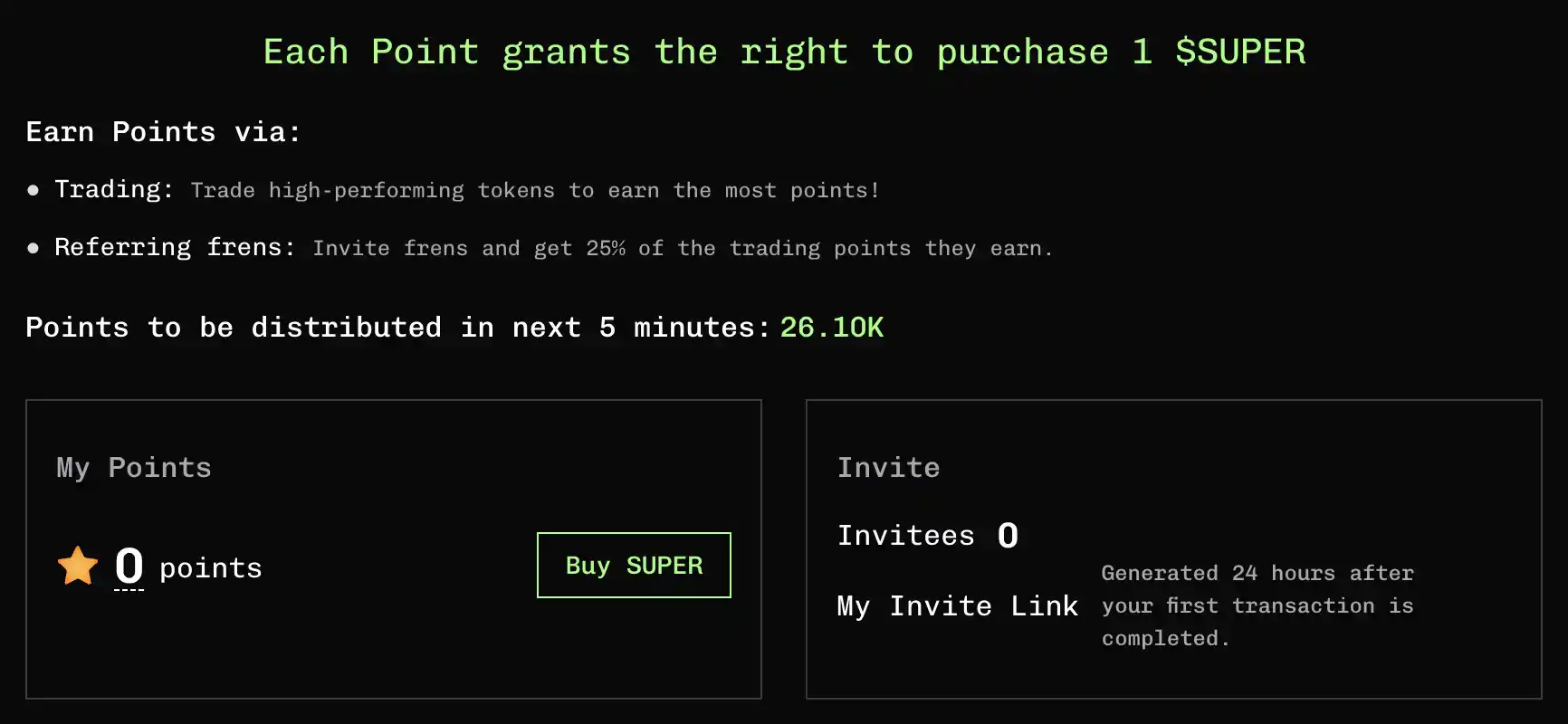 目前官网只给出两种获得$SUPER 的方式:交易和拉新。交易表现越高的代币,赚取的积分越多;邀请好友则是可以获得他们交易积分的 25%。1 积分 = 购买 1 SUPER 的权利,相当于只有平台活跃的交易者才有购买$SUPER 的权利,有利于让真正使用平台进行交易的早期用户享受红利,而不是让鲸鱼们在新的 DeFi 协议中锁定数百万的流动性。
