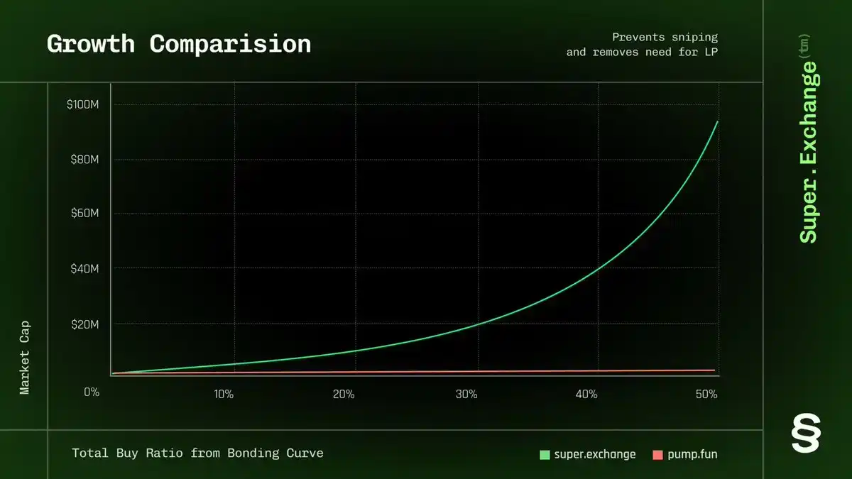 所以 Super Curve 解决了什么?传统的 bounding curve 因为早期增长过慢,某些买家可以积累很大比例的代币供应量。而在后期,由于曲线增长过快,会导致流动性缺口,且在没有做市商支持的情况下,继续交易会很困难。但是利用 Super Curve,所有价格区间都有永久锁定流动性,避免了 rug 风险,确保价格可持续增长。