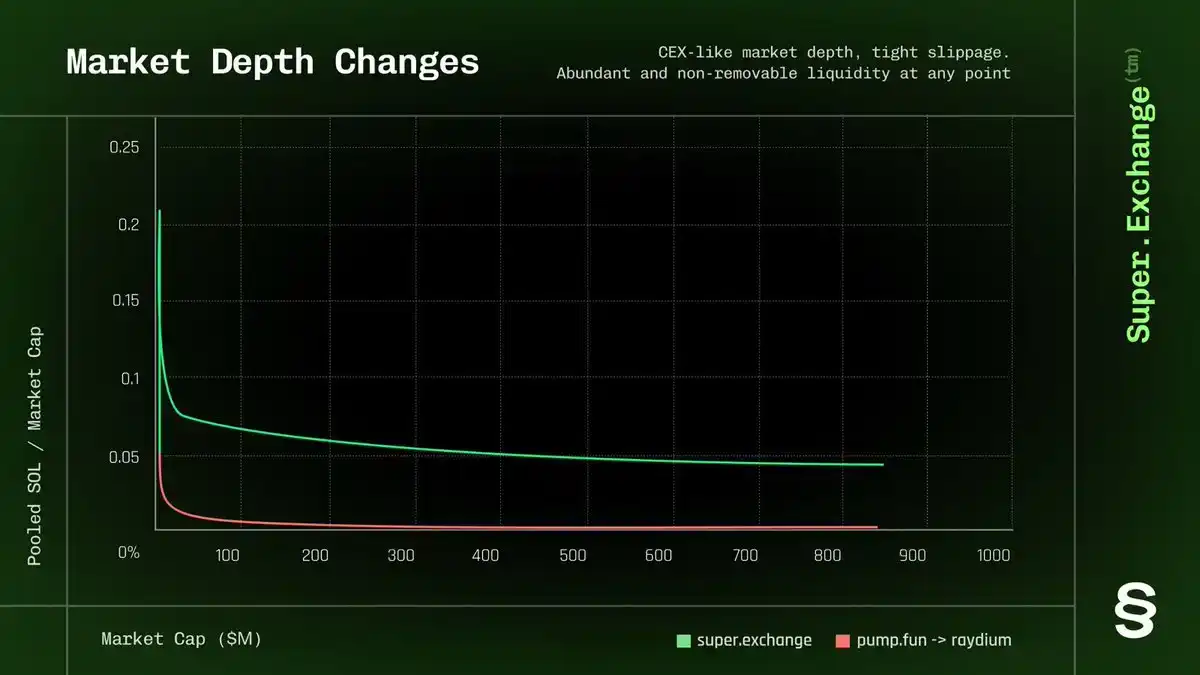 在 Pump.fun 上,随着市值的增加,池子的深度迅速下降。Super.exchange 通过消除对流动性提供者的依赖,防止撤池子,确保可持续的流动性,创造了一个安全且有增长潜力的交易环境。