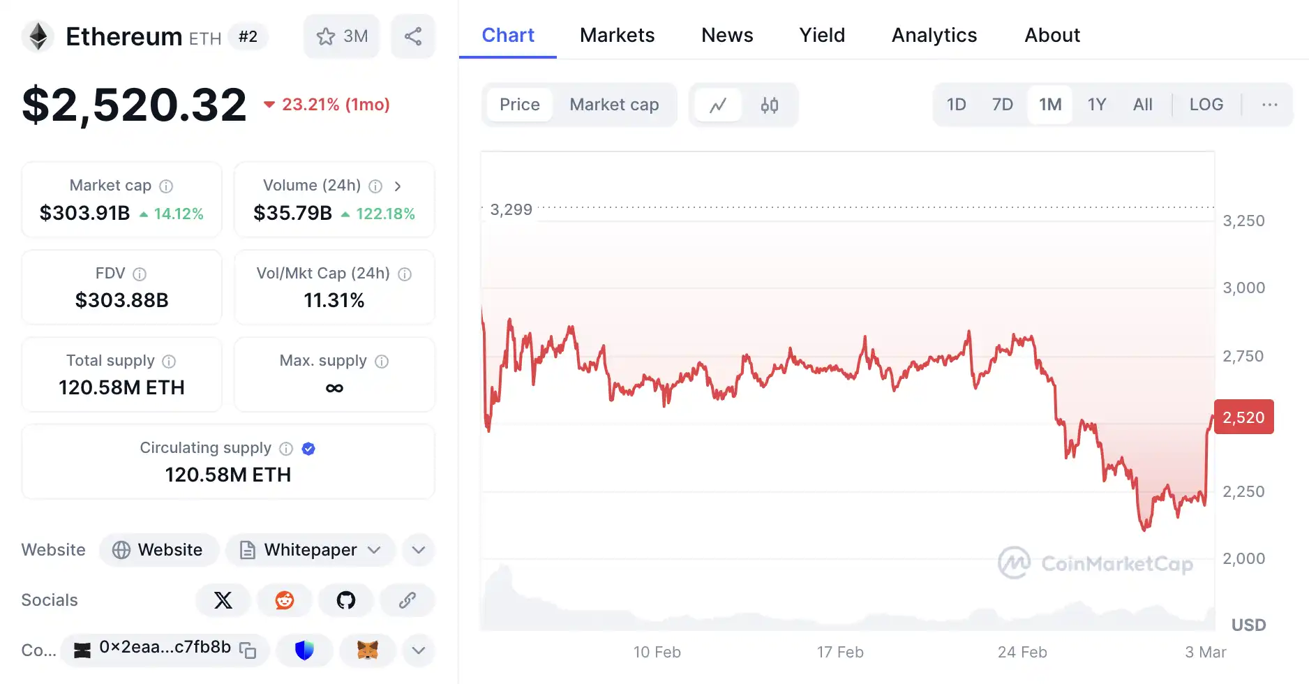 以太坊 ETF 在去年 7 月 23 日正式登陆美国资本市场,当天以太坊价格在 3200 美元左右。行情数据显示,以太坊 ETF 上线半年左右以来的净流入为 28.2 亿美元,相当于华尔街购买了接近 1% 以太坊的体量,而目前以太坊却下跌到 2500 美元附近。