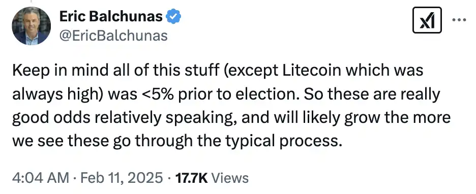 目前,Grayscale 和 Canary Capital 提交了 LTC 现货 ETF 申请,SEC 均已受理。彭博社分析师 Eric Balchunas 对此表示,相信 Litecoin 将成为下一个获 SEC 批准的加密现货 ETF。