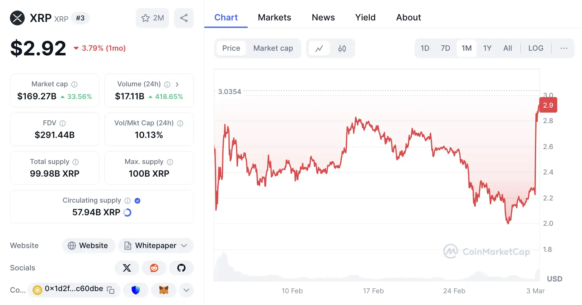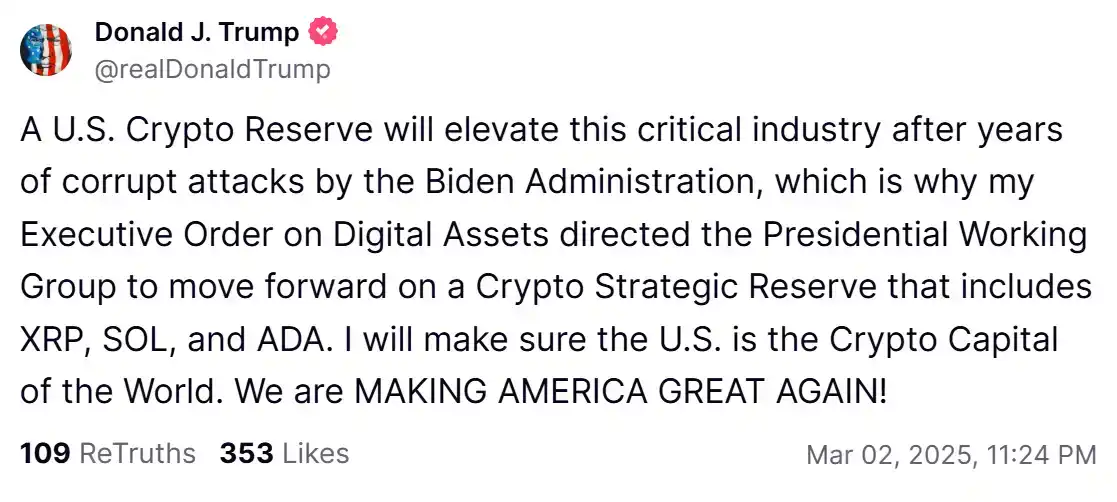 历经瀑布洗脸的低迷市场终于迎来一剂强心针。美国当地时间 3 月 2 日,特朗普于社交媒体发文表示,「在拜登政府多年的打压之后,美国加密货币储备将提升这一关键行业的地位,这就是为什么我的数字资产行政命令指示总统工作组推进包括 XRP、SOL 和 ADA 在内的加密货币战略储备。我将确保美国成为世界加密货币之都。我们正在让美国再次伟大!」、「显然,BTC 和 ETH 以及其他有价值的加密货币将成为储备的核心。我也喜欢比特币和以太坊!」