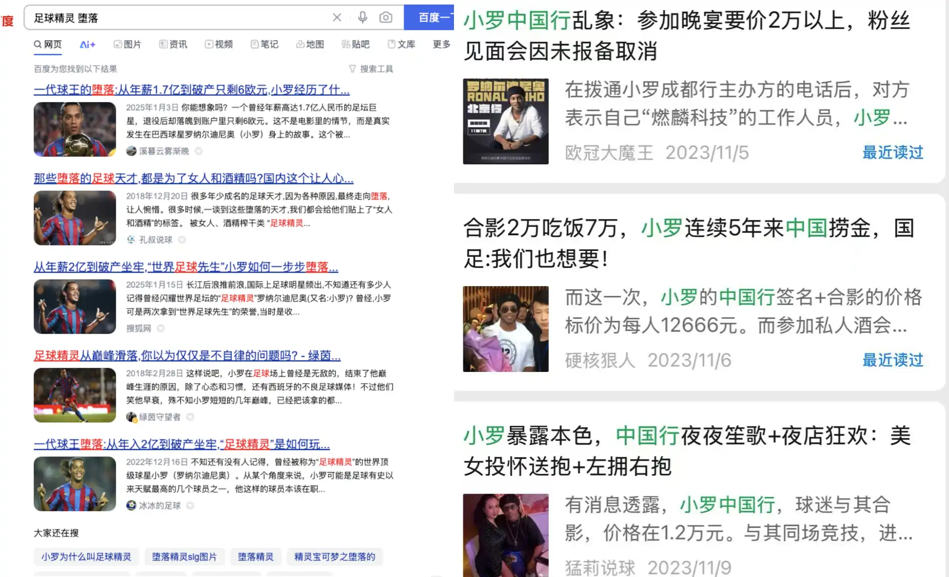 小罗的「圈钱地图」几乎覆盖全球:在巴西、阿根廷等地举办个人足球训练营,收费昂贵,但训练质量却备受诟病,不少家长直言:「我们花钱买的就是他的一张脸。」曾有消息称,他在西班牙以「足球偶像」身份参与商业活动,甚至愿意为任何企业站台,只要价格够高。在沙特、阿联酋这些富豪俱乐部的地区,也曾邀请他做嘉宾,开出的报价极为丰厚。