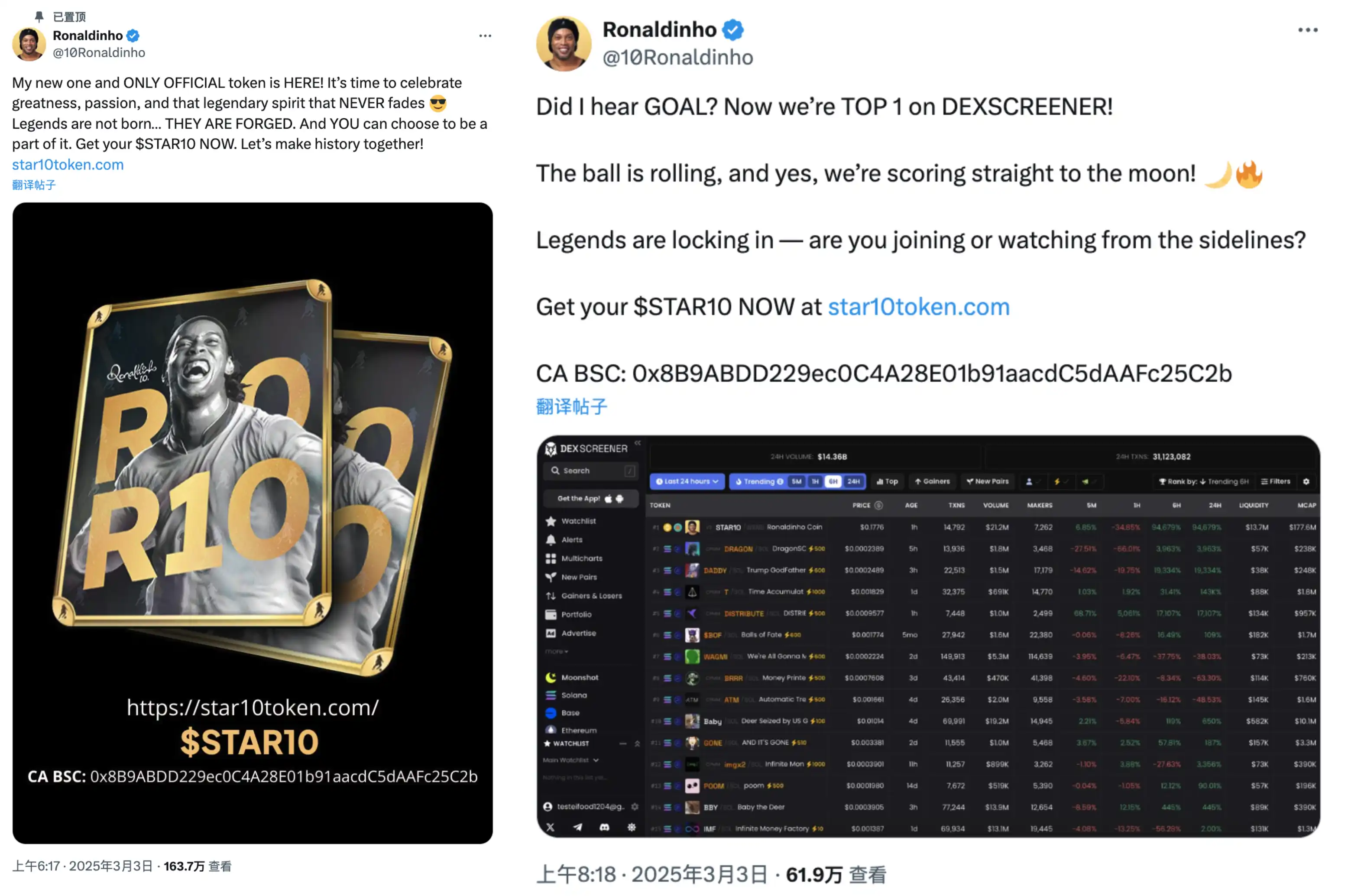 北京时间 3 月 3 日早上 6 点多,和特朗普币发行的时间一样选在了美东的休市时间,罗纳尔迪尼奥在推特上公布了自己发行的官方代币,STAR10。