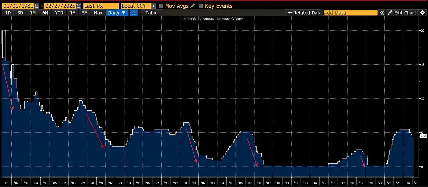 这是一张联邦基金利率下限的图表。每个红色箭头都代表着与衰退同时发生的宽松周期的开始。正如你所看到的,非常清楚的是,美联储至少会在衰退期间降息。