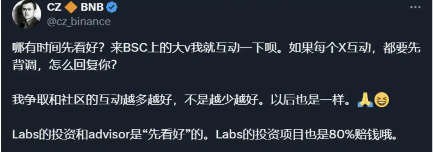 · 哪有时间先看好?来 BSC 上的大 V 我就互动一下呗。如果每个 X 互动,都要先背调,怎么回复你?
