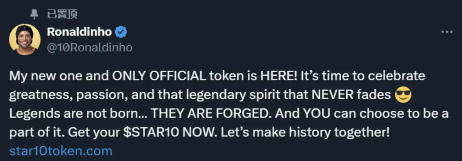 巴西传奇足球运动员罗纳尔迪尼奥(Ronaldinho Gaúcho)昨日(3 日)在 X 上发文表示,自己已经在币安链(BNB Chain)上推出了个人官方迷因币$STAR10: