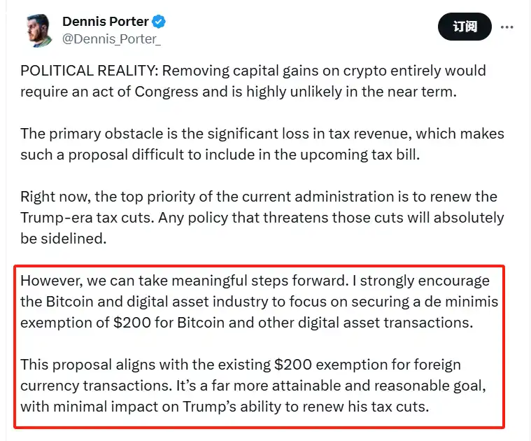 而 Satoshi Action Fund 联创 Dennis Porter 表示完全取消加密税在短期不切实际,但如「最低豁免额」之类的改变是可以争取一下的。
