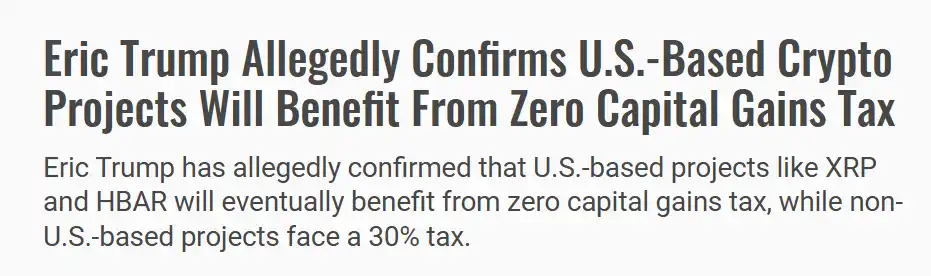 此前就一直有相关消息围绕着对于加密货币税的更改做文章。1 月,The Street 就曾报道热衷于参与加密活动的特朗普之子 Eric Trump 证实如 XRP、HBAR 等美国顶级加密项目将享受零资本利得税的优待,而非美国项目将面临越 30% 的资本利得税。