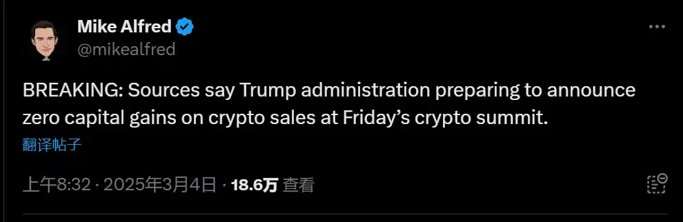 3 月 4 日上午,Alpine Fox LP 创始人 Mike Alfred 发推透露,特朗普政府或将在周五加密峰会上获奖宣布加密货币销售零资本利得税政策。