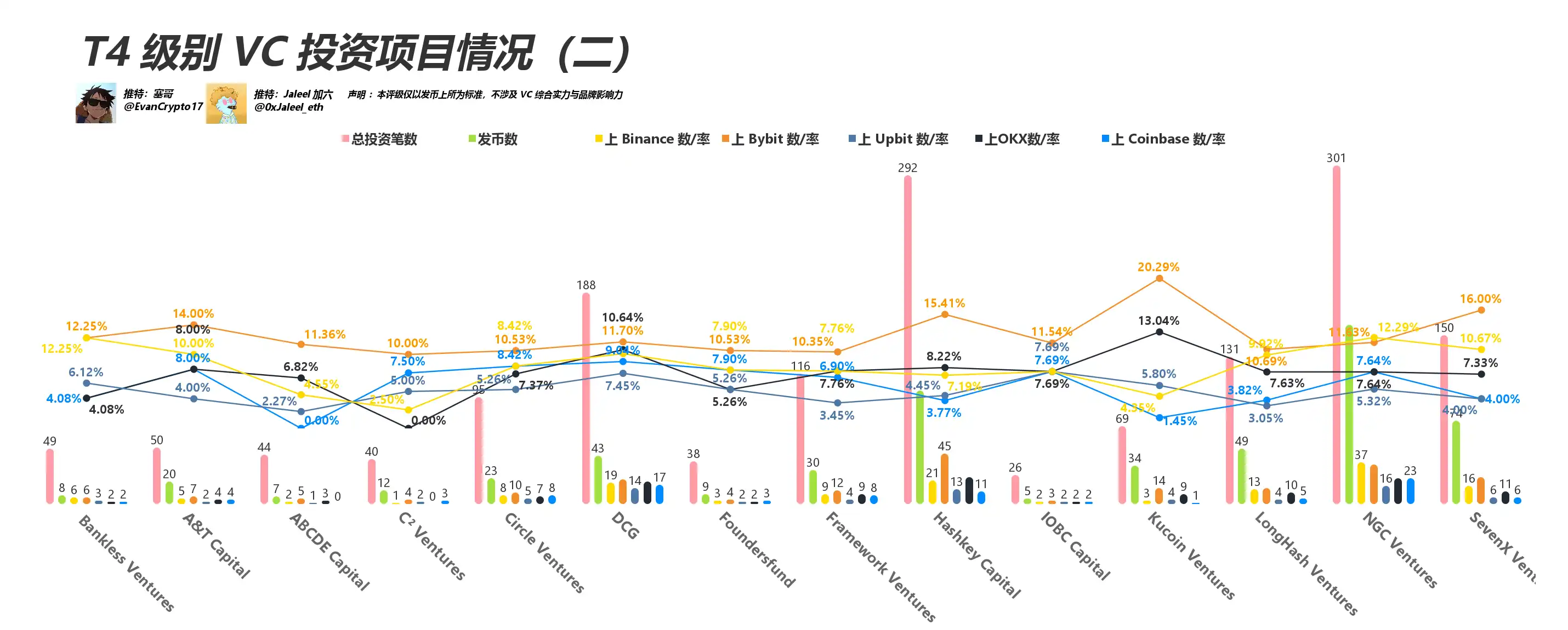 Jump Crypto、HTX Ventures(火币):有交易平台背景,但此处仅统计其被投项目在第三方交易平台上线率,因此数字未能全面反映他们真正的资源优势。