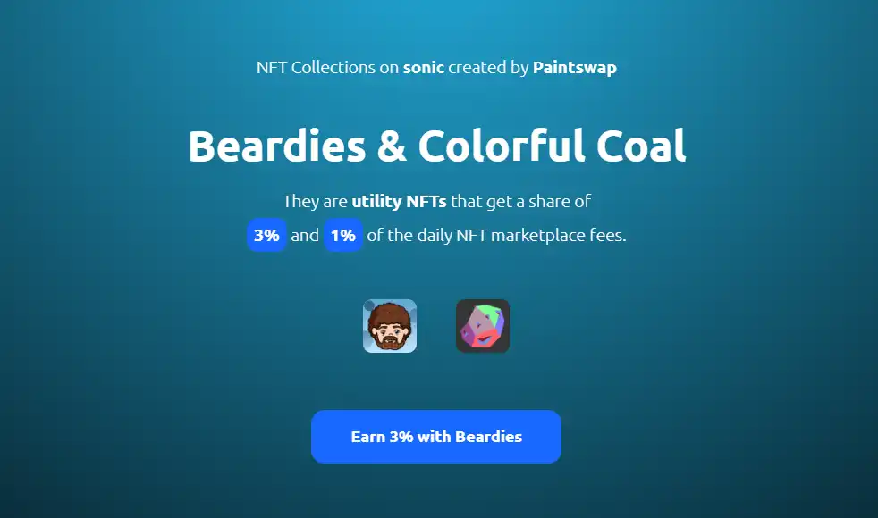 该 NFT 系列可以获得 Paintswap 交易市场每日手续费收入的 3% 作为分红。此外有一个项目 Colorful Coal 是官方之前给 Beardies 的空投,也可以获得 Paintswap 交易市场每日手续费收入的 1% 作为分红。