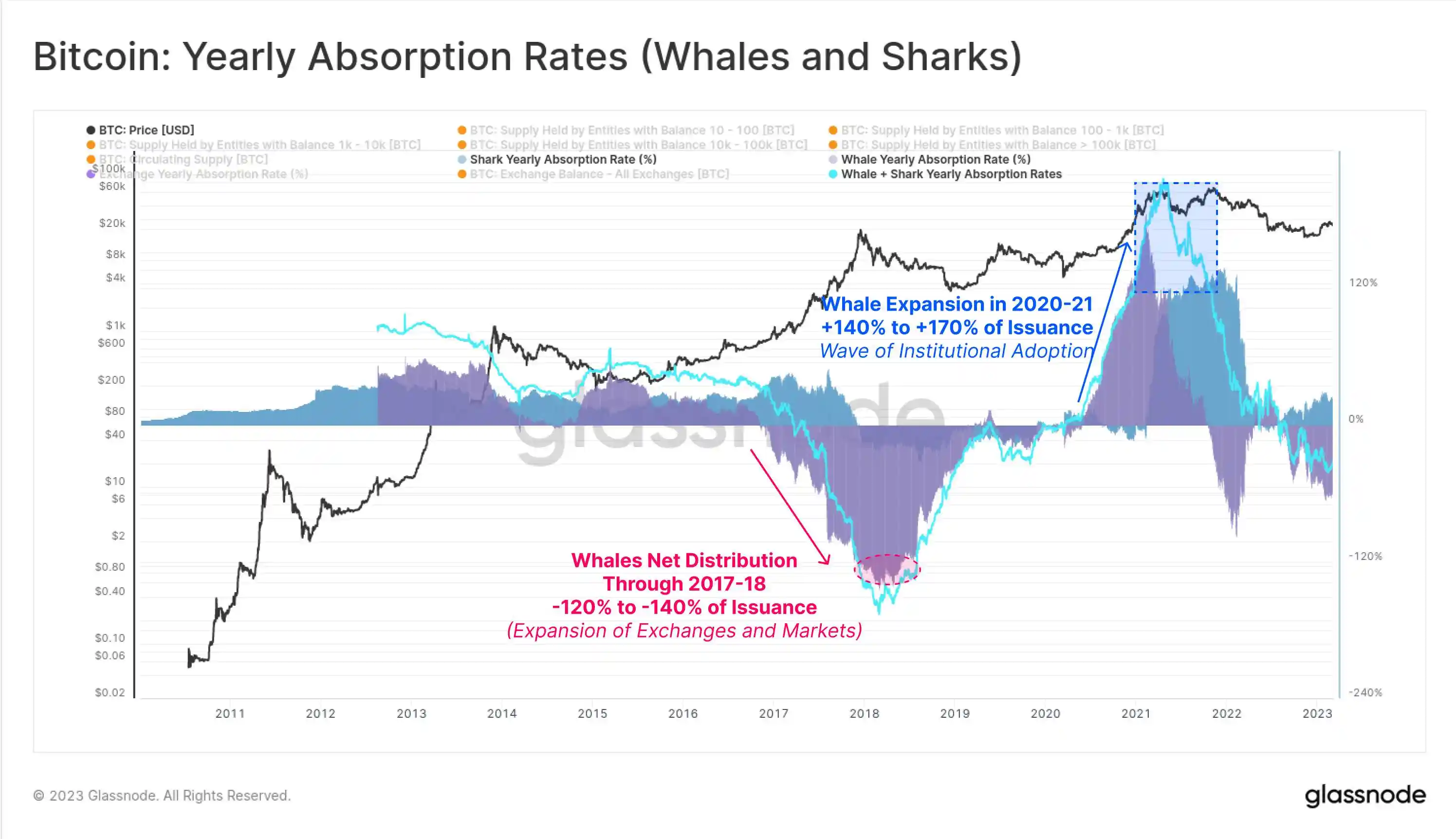 例如 2017 年牛市接近顶峰时,鲸鱼持有的比特币余额净减少,表明大量筹码从鲸鱼手中转移出去,原因在于当时有海量新增需求涌入市场,提供了足够的流动性让鲸鱼们分发其持仓,详见:The Shrimp Supply Sink: Revisiting the Distribution of Bitcoin Supply。