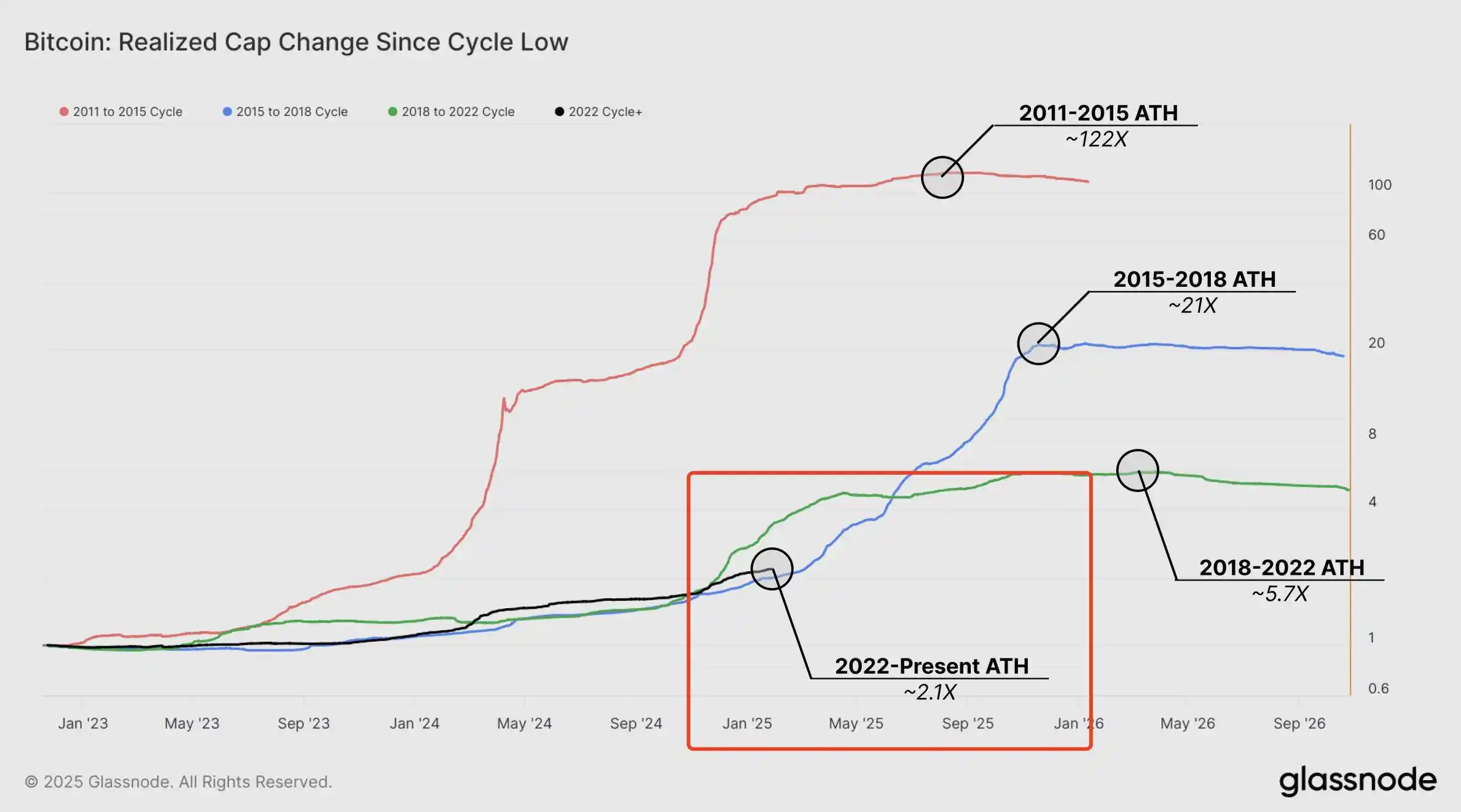 已实现市值(Realized Cap)是衡量市场资金流入情况的重要指标。与传统市值(Market Cap)不同,已实现市值并非简单地用当前价格乘以流通供应量,而是考虑了每一枚比特币在链上最后一次交易时的价格。因此,它更能反映市场实际投入的资金规模。