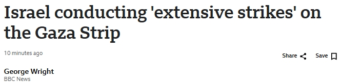 英国BBC消息称,以色列军方称正在对加沙地带进行“大规模打击”。加沙地带主要紧急响应服务机构——哈马斯控制的民防机构发言人指出,至少有34名巴勒斯坦人被杀,70人受伤。