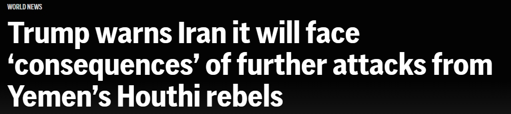 美联社(AP News)报道,特朗普周一明确将也门胡塞叛军的行动与该组织的主要支持者伊朗联系起来,并警告德黑兰将为该组织的进一步袭击“承担后果”。