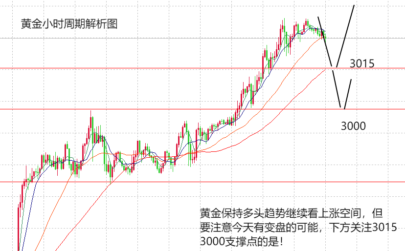 美指在周二走出了反弹,黄金在周二先涨后调整,走出了微跌,走势比较符合美指和黄金的反相关关系,值得注意的是,美指有可能在近期出现见底的形态,后市有可能会出现连续空间。黄金则在周二连续上涨过程中,出现暂时的高点3037,虽然超出了山海预期的3030高点,但经过美盘的调整回落,现在收盘在3030之下,今天需要注意的是,在维持多头看涨趋势之下,谨慎对待这波上涨,周三,周四可能是黄金多空变盘,转折的时机,加上今晚有美联储利率和鲍威尔讲话的影响,所以,更加增大了黄金变盘的可能性。从技术面来看,趋势肯定是多头,这一点毫无疑问,周线大阳之下,暂时没有一点见顶的表现,但日线周期,H4周期都已经在高位形成绝对的背离,即使现在看涨,也要出现随时能出现的下跌,日线周期的趋势支撑有两个点位3000,2955,看似价位跨度比较大,但实则出现下跌很容易走出来,H4周期的趋势支撑点在3015,3000,也就是说,今天极强弱关键点在3015,破位3015,黄金就不再那么强势,极有可能会去3000,而3000是这波强弱关键支撑,此点位破位就不在看单边上涨,再去看2955,所以,今天亚欧盘先看3015得失,在不破位的前提下,跟随趋势继续看上涨空间,但如果形成破位,那么,今天黄金就要注意转向看调整空间至3000或者更低。今天不管是技术面的看法,还是时间周期都有变向的可能性,大家一定要注意。