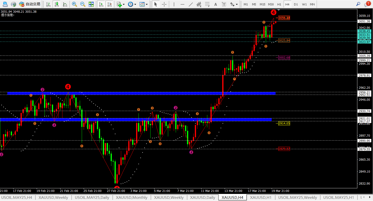 目前黄金上涨接近预测顶部,所以高位追多得当心必须严格止损。目前就等大周期的做空信号出现。短期下方关注3038和3024附近的支撑,下破将开启回落。