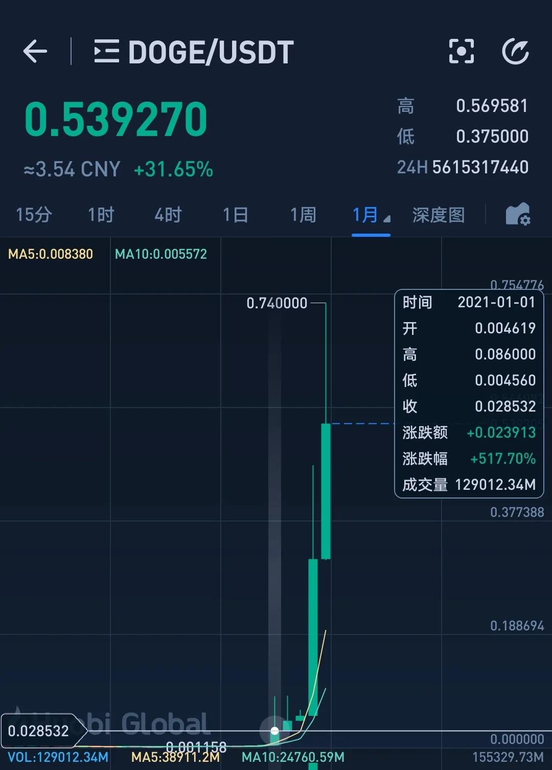 最近狗狗币也是火的一塌糊涂,靠着马斯克的站台,一路飙涨,从2021年元旦到现在涨了100多倍了[泪奔]