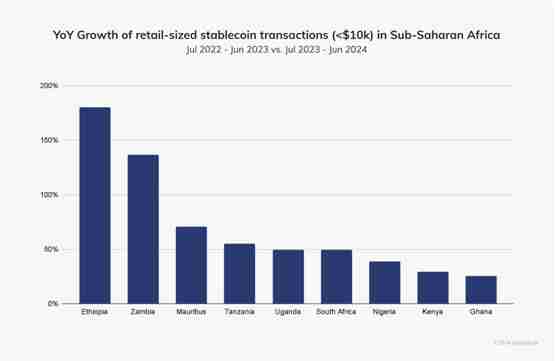 而为非洲第二大国,拥有1.23亿人口的衣索比亚,成为稳定币零售转帐增长最快的国家,年增长率达到惊人的180%。但在2023年7月,衣索比亚政府放宽了货币限制,目的是为了争取从国际货币基金组织和世界银行获得107亿美元的贷款,导致法币比尔(ETB)贬值30%,进一步加剧了当地对稳定币的需求。