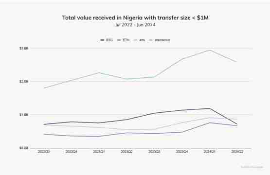 下方图表以低于100万元转帐规模为基准,可以看到尼日利亚在2024年第一季度稳定币交易量接近30亿美元,显然稳定币正在成为中小型交易的首选媒介,正广泛使用。