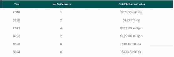 2024年共达成8笔和解,美国监管机构获得的金额比2023年增加了78%,当时仅获得108.7亿美元,而与2022年相比,今年迄今的和解金额已增长8,327%。
